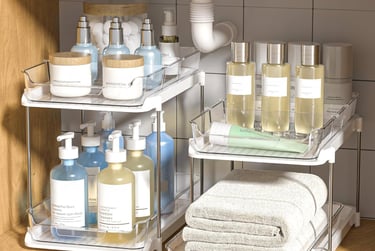 If your kitchen cabinet looks like a disaster zone, an under-sink organizer can completely transform the space. These sliding storage shelves make it easy to access cleaning supplies, sponges, and dish soap without digging through clutter.