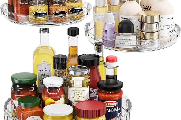 A turntable organizer (often called a Lazy Susan) makes it easy to access items in cabinets, pantries, and refrigerators. Just spin it to find exactly what you need.