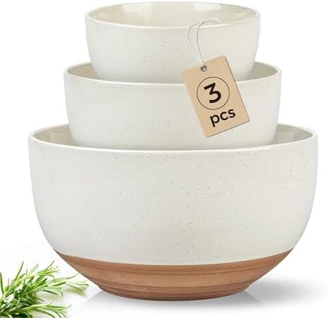 Discover the Amorarc Ceramic Mixing Bowls Set, featuring three nesting stoneware bowls with a charming rustic terracotta underside. Perfect for mixing, cooking, baking, or serving salads, these stylish bowls are microwave and dishwasher safe, making them a practical addition to any kitchen.